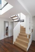Matériaux de la surélévation : structure et charpente bois, toiture zinc, isolation fibre de bois, doublages intérieurs fermacell.